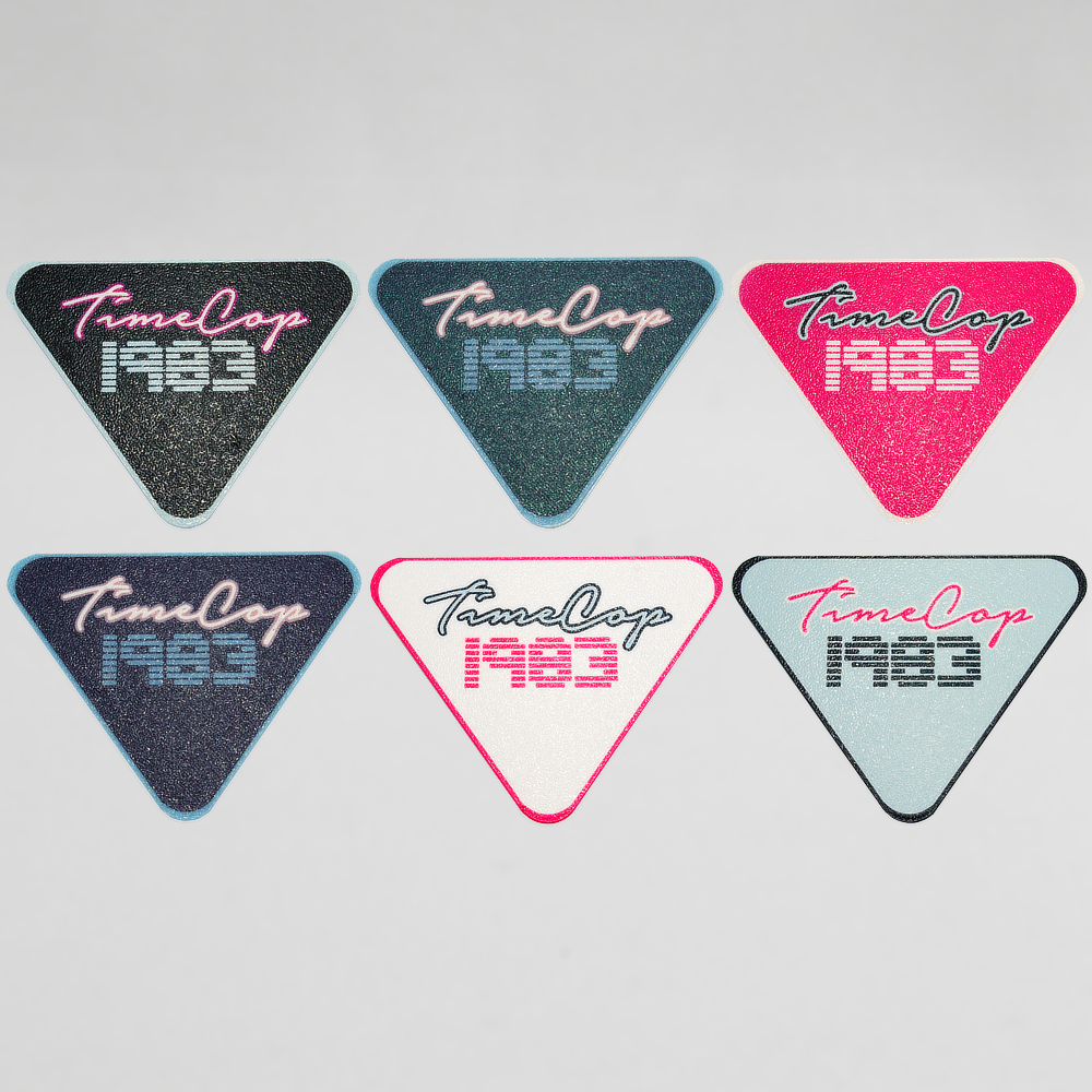 3D printed Timecop 1983 triangle mixed coaster set of 6 different colors: black, white, pink, blue, purple and blue galaxy glow.