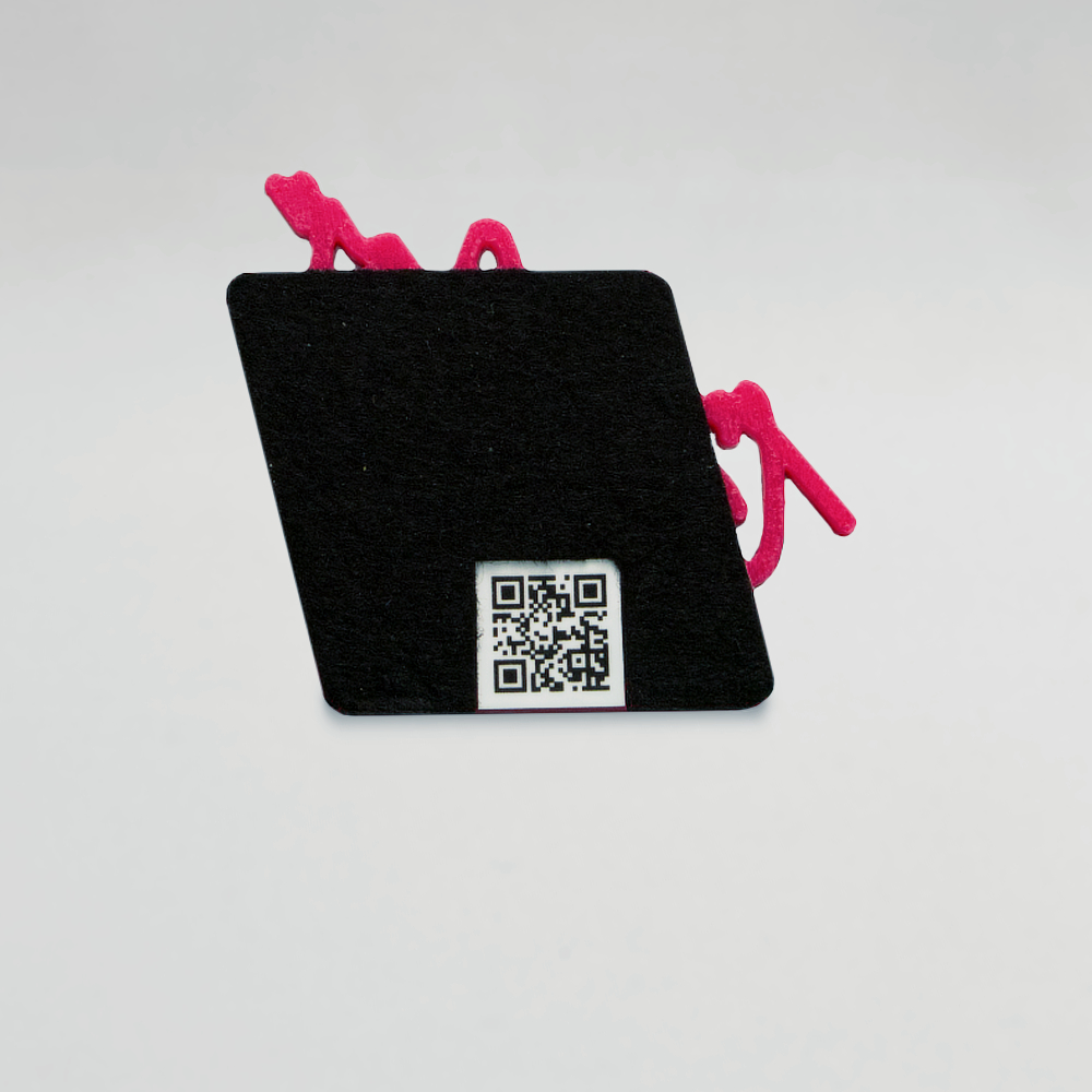 The fridge magnet is 7,5 cm (2,95 inch) wide. On the back is a QR code, which you can scan for more merch.