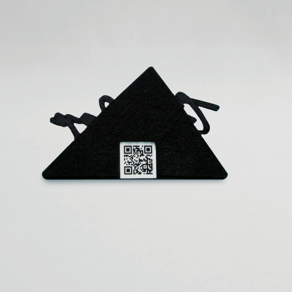 The fridge magnet is 7,8 cm (3,07 inch) wide. On the back is a QR code, which you can scan for more merch.