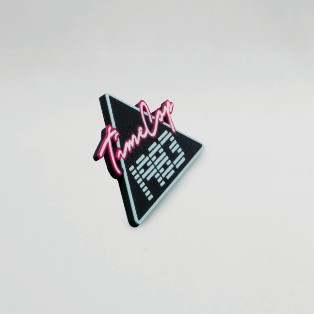 3D printed Timecop1983 triangle black fridge magnet, with the colors: white, blue and pink.