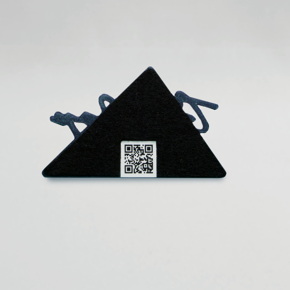 The fridge magnet is 7.8 cm (3,07 inch) wide. The bottom is covered with black felt. On the back is a QR code, which you can scan for more merch.