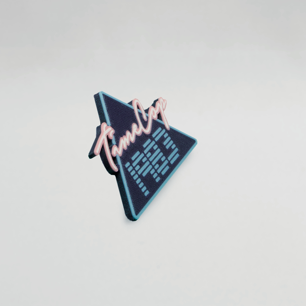 The Timecop1983 triangle purple galaxy glow fridge magnet is printed with PLA galaxy, infused with glass microsphere additives. This unique blend creates dynamic reflections with a glossy blue shimmer. The top is printed on a textured plate, creating a shiny structure effect. The logo is printed with pink and blue glow in the dark.