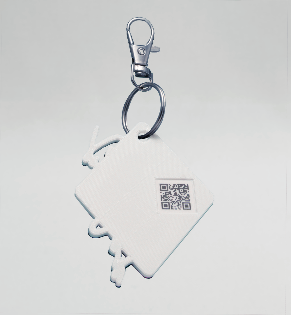 The keychain is 7,5 cm (2,95 inch) wide and has a rotatable key ring. On the back is a QR code, which you can scan for more merch.