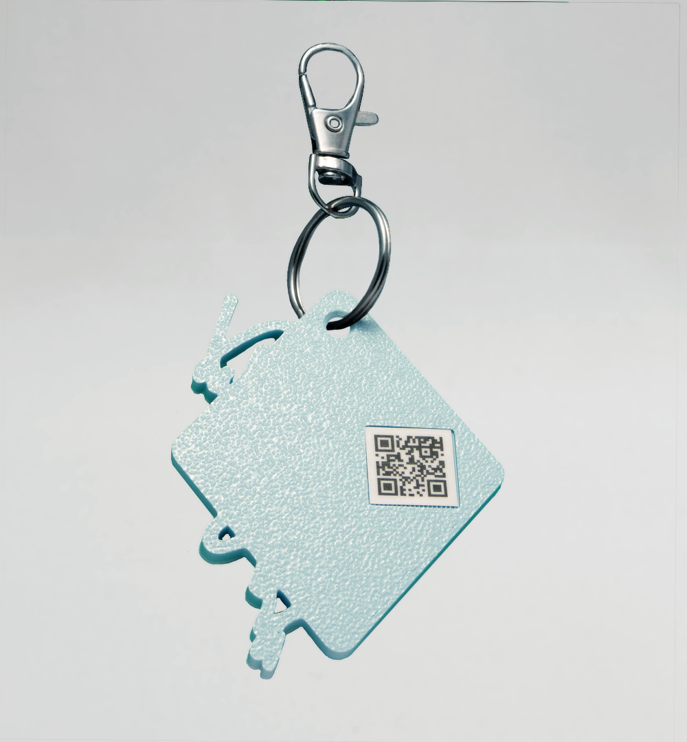 The keychain is 7,5 cm (2,95 inch) wide and has a rotatable key ring. On the back is a QR code, which you can scan for more merch.